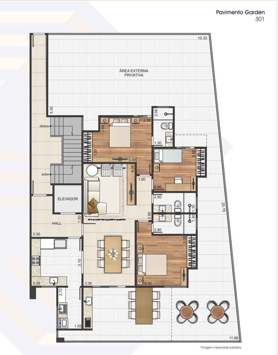O apartamento garden tem uma área externa exclusiva e muito espaçosa, esta mesma área faz a ligação com as 2 extremidades da unidade, a parte íntima fica privativa porém junto a área social que por sua vez é integrada a varanda gourmet, as vagas de garagem são de fácil manobra.